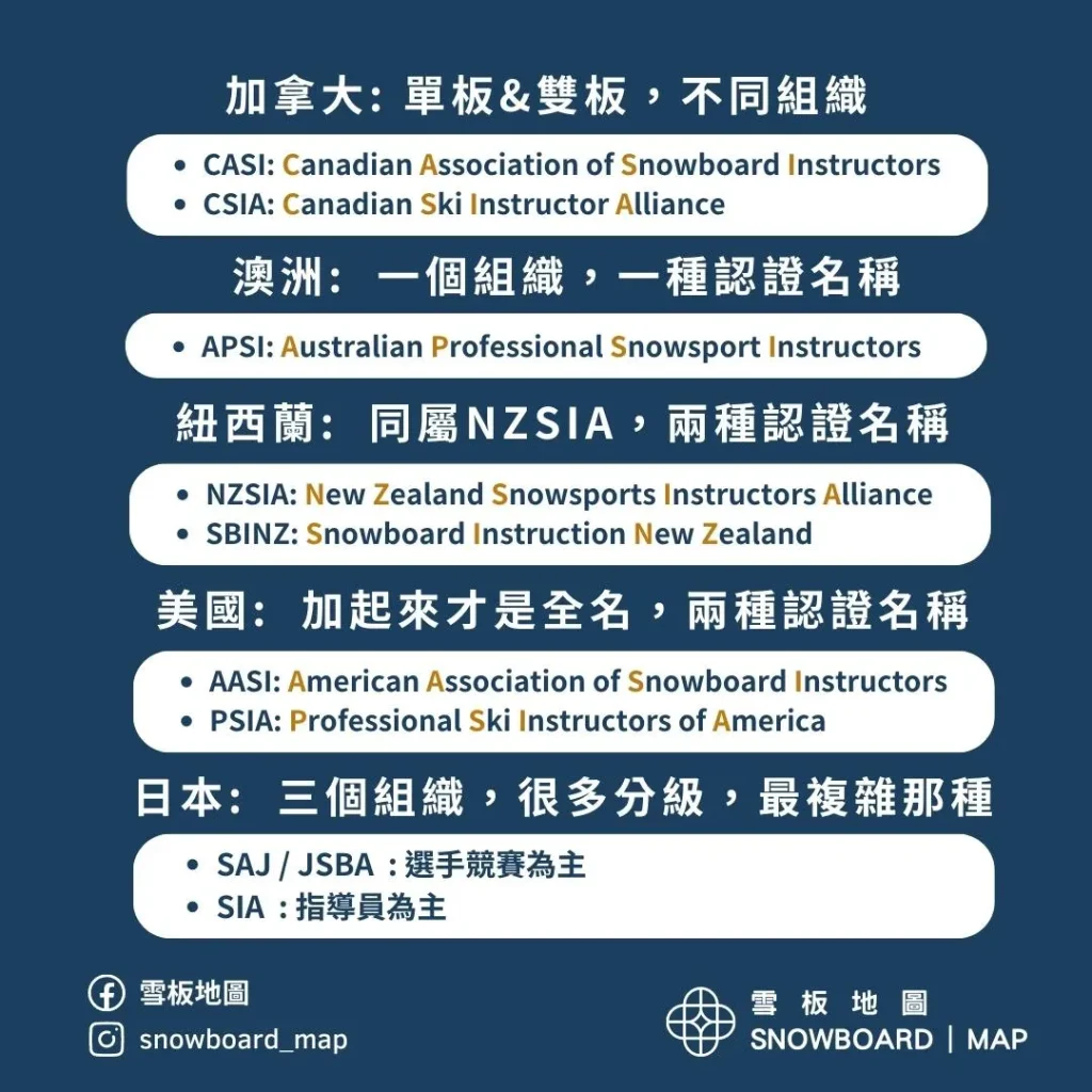 以下是最常看到的滑雪教練證照以及他們的認證組織,包含加拿大、澳洲、紐西蘭、美國和日本的認證機構,以及他們核發的Snowboard單板及Ski雙板教練認證